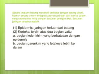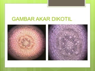 Struktur Anatomi Akar Dikotil Dan Monokotilmembentuk xylem dan kearah luar membentuk floem. Dan secara umum dapat pula dikatakan bahwa tumbuhan dikotil memiliki ciri berupa akar tunggang bentuk tulang daun menjari tidak di temukannya tudung akar bunga kelipatan 5 dan biji berkeping 2dua sedangkan pada tumbuhan monokotil memiliki ciri berupa akar serabut.